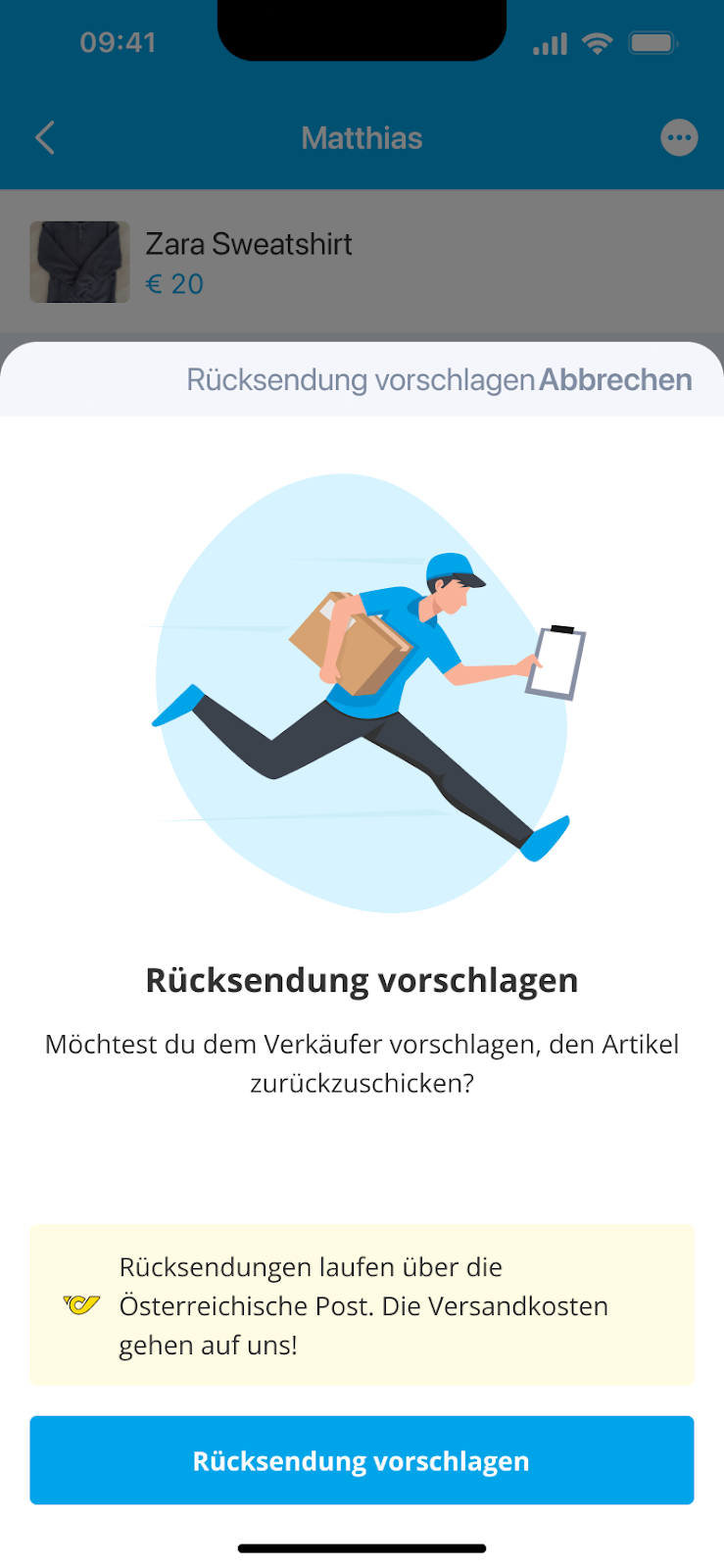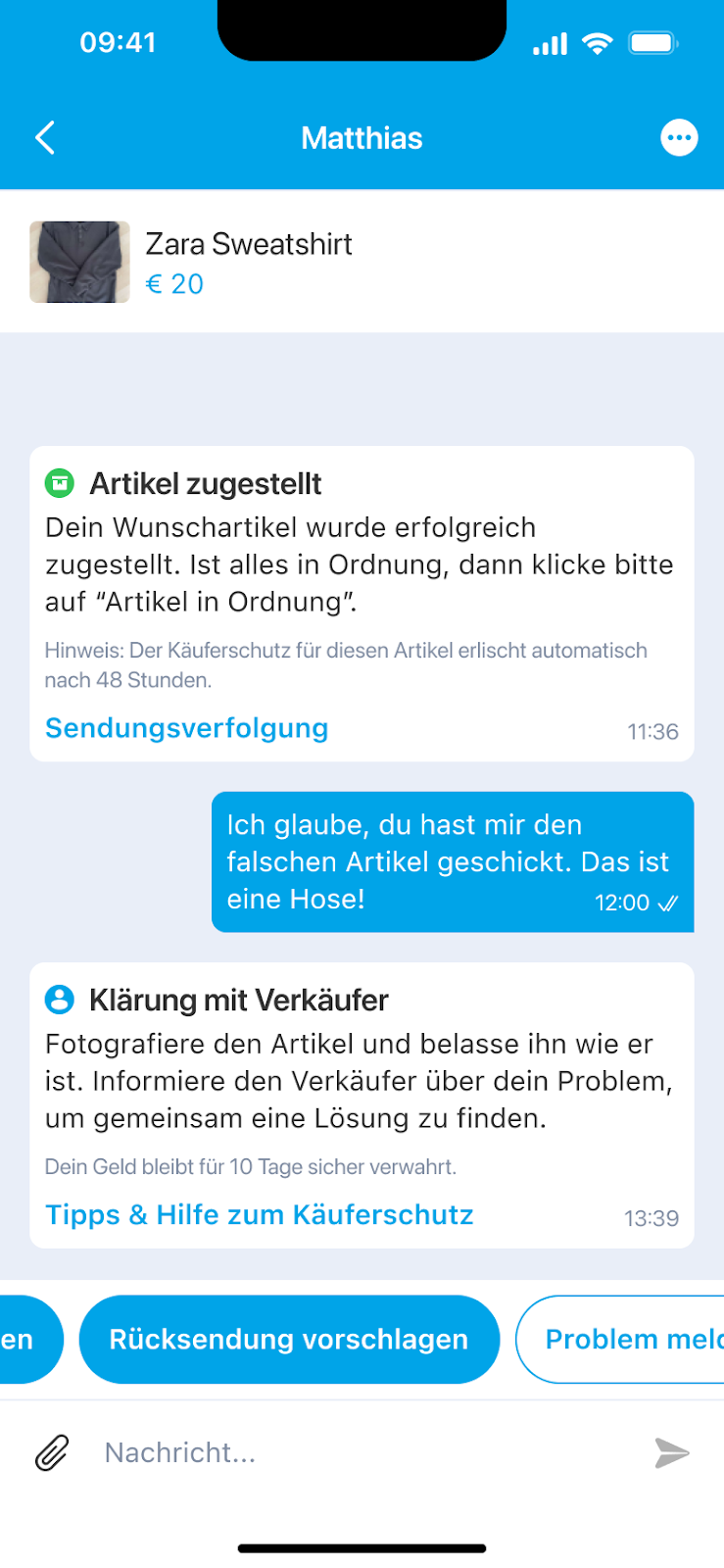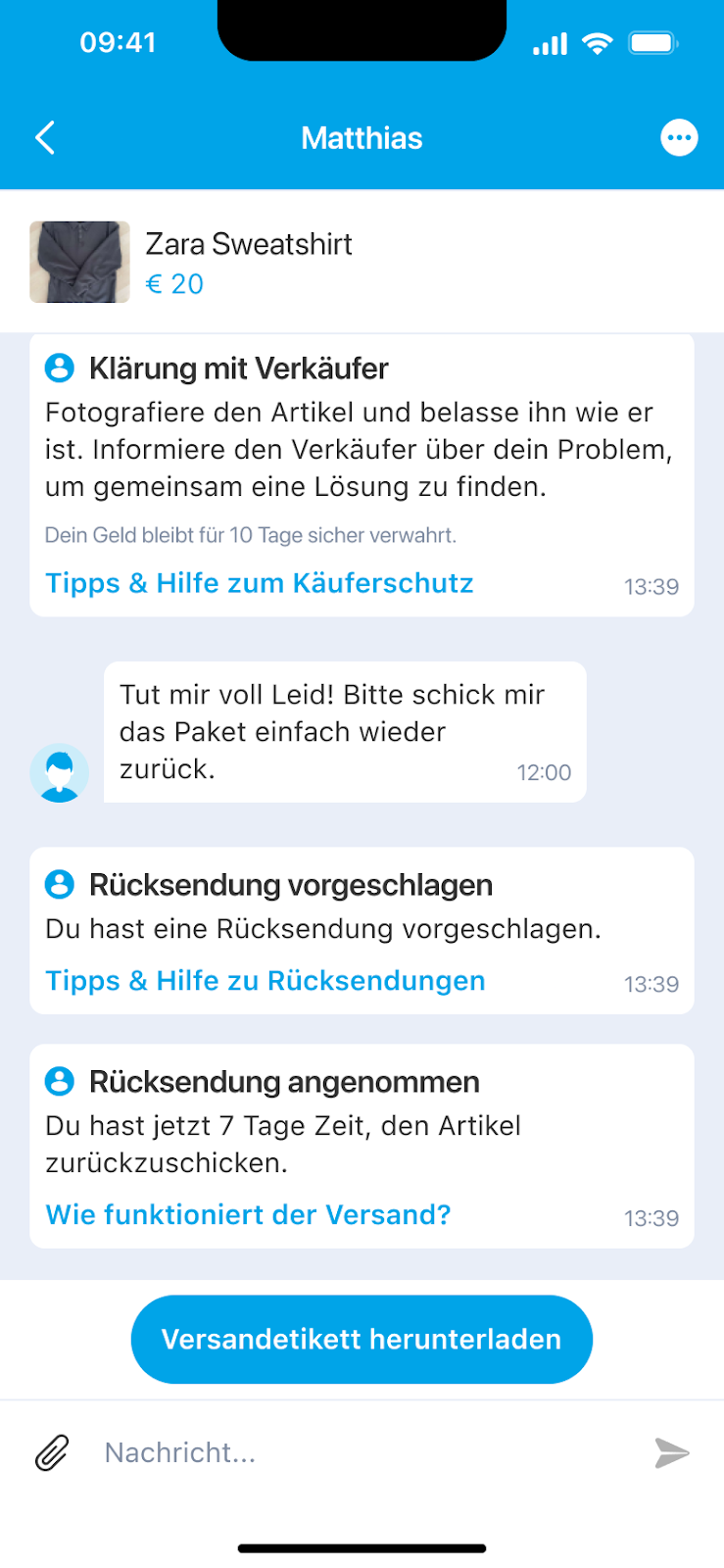Sollte der Käuferschutz dennoch in Anspruch genommen werden müssen, obwohl bereits eine Rücksendung vorgeschlagen wurde, ist dies nur möglich, sofern der:die Verkäufer:in der Rücksendung noch nicht zugestimmt hat.