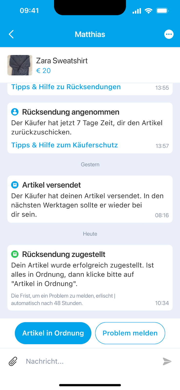 Verwende den Button "Support kontaktieren" um das Käuferschutz-Team entsprechend zu informieren.