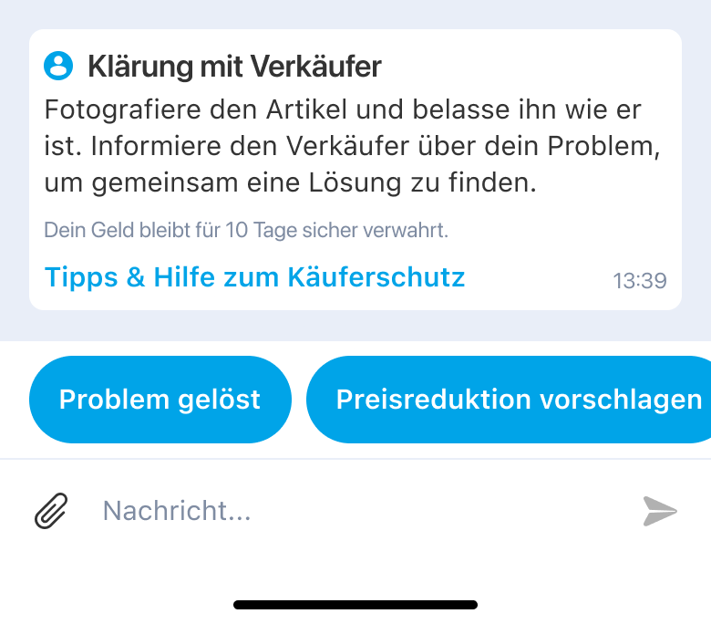 Ansicht für die:den Käufer:in im willhaben-Chat mit dem Button "Problem gelöst":