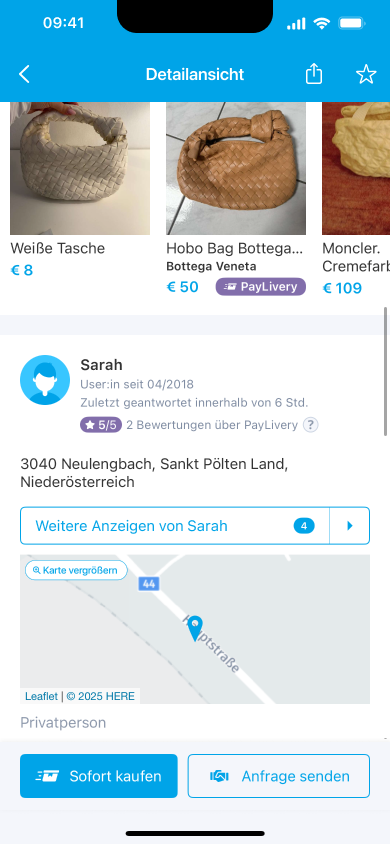 Du findest die PayLivery-Bewertung bei den Kontaktdaten der:des Verkäufers:in in der Anzeige.