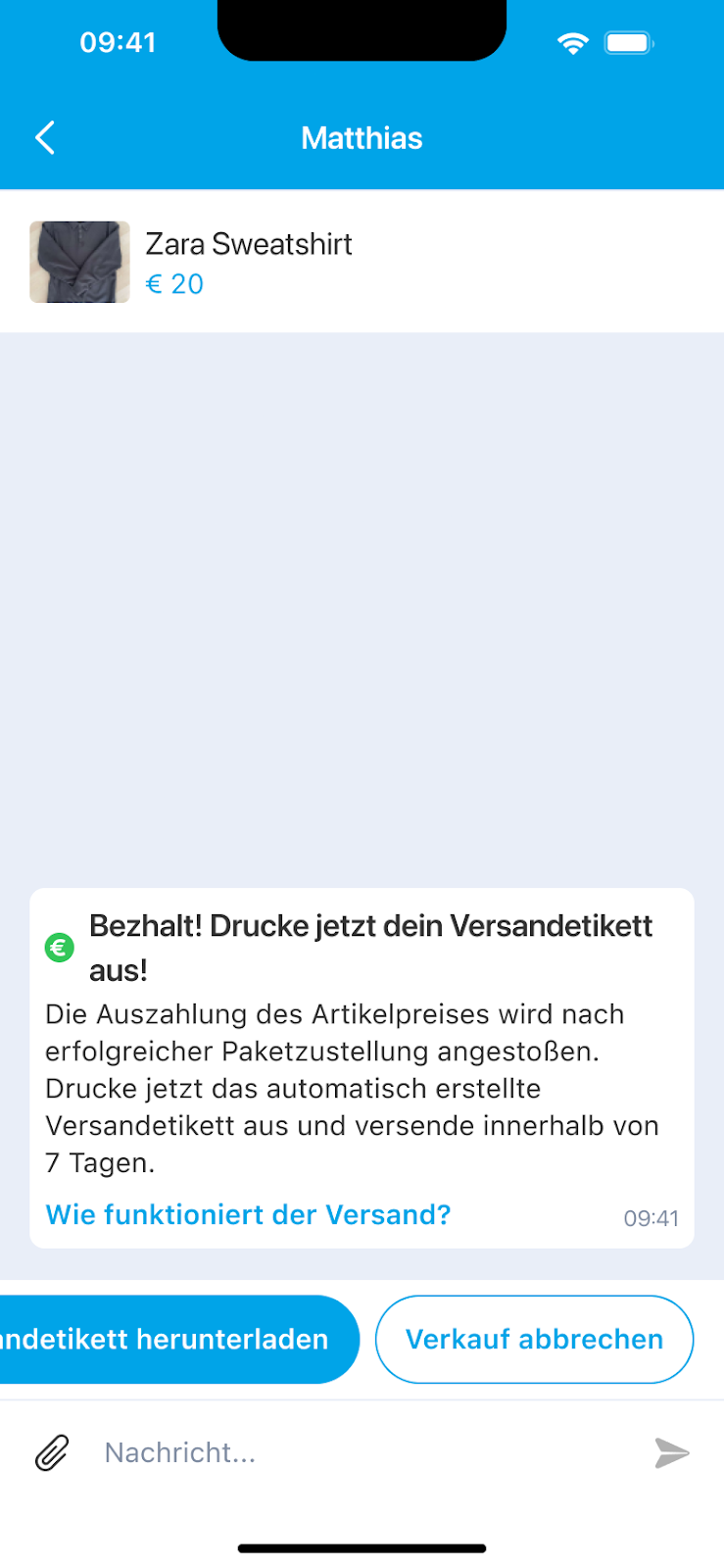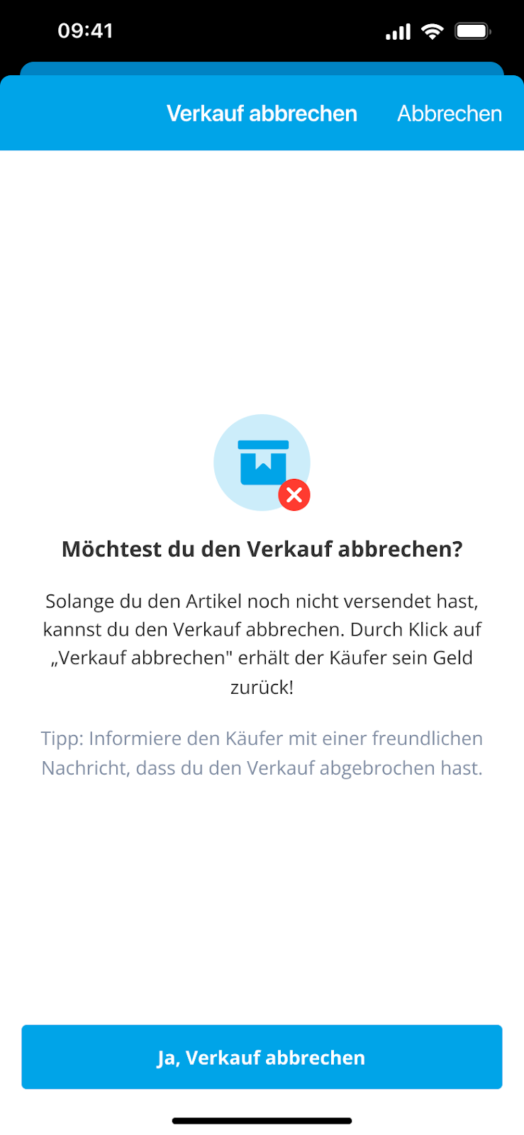 Solange das Paket noch nicht versandt wurde, hast du als Verkäufer:in die Möglichkeit den Verkauf abzubrechen.